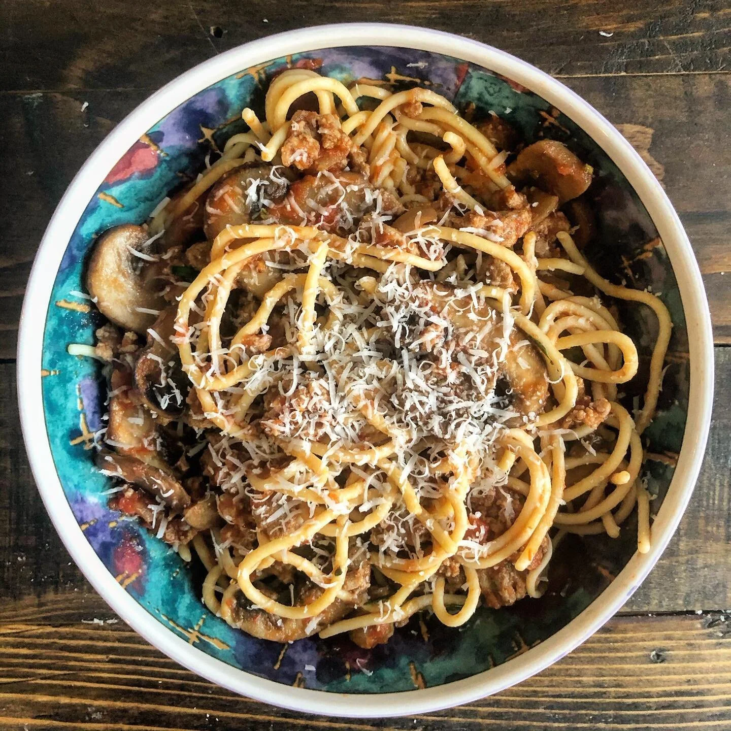 Here’s my take on spaghetti with turkey ragu. I of course added mushrooms, and topped it all off with pecorino 🤤 Was craving extra fat so I ended up mixing in some home made cashew cream later on,